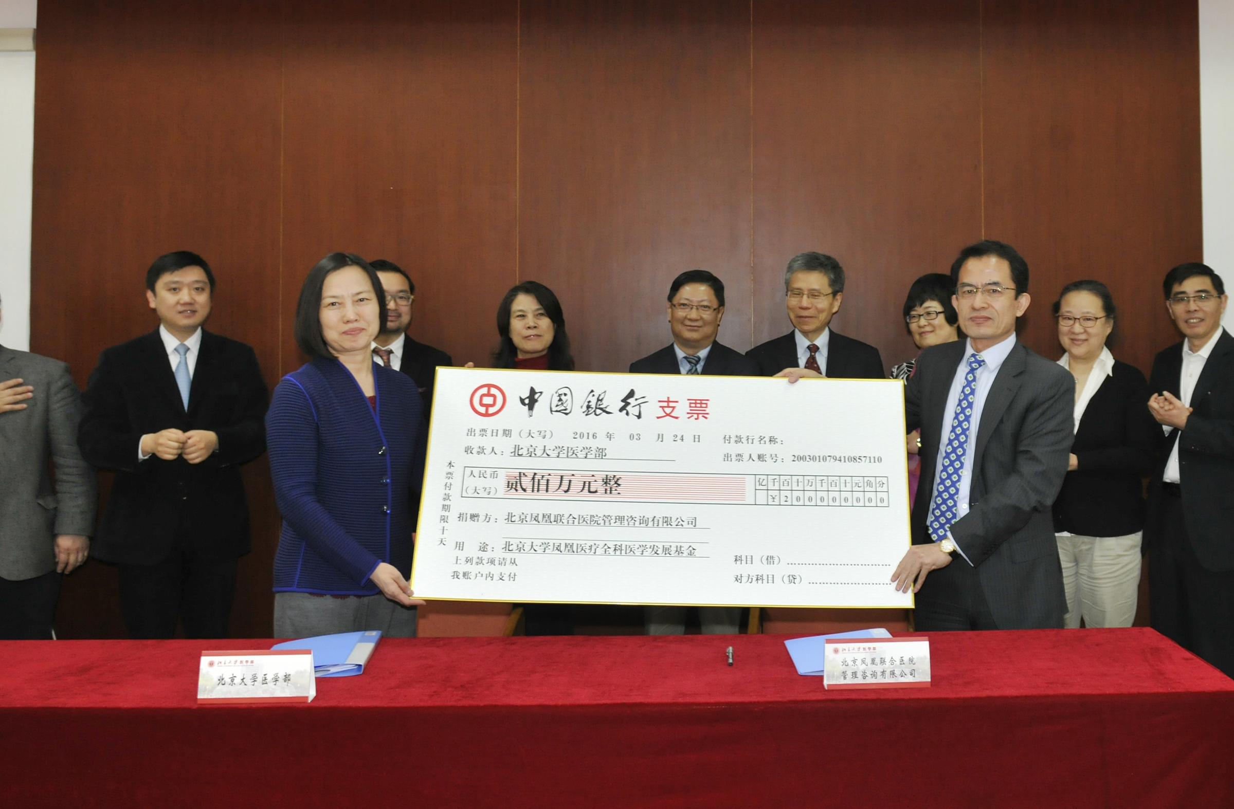 3月24日,北京凤凰联合医院管理咨询有限公司与北京大学医学部举行了“北京大学凤凰医疗全科医学发展基金”签约仪式。凤凰医疗集团董事长梁洪泽先生,董事、执行总经理张晓丹先生,董事、副总经理、医疗总监徐泽昌先生,董事、副总经理单宝杰先生,董事、财务总监江天帆先生,北京大学常务副校长、医学部常务副主任柯杨,医学部副主任段丽萍,医学部两办主任、医学教育基金管理办公室主任肖渊,医学教育基金管理办公室副主任孙莉莉,医学部继续教育处处长姜辉,医学部全科医学学系主任郑家强、常务副主任迟春花、副主任苗懿德和孙凌波,北京大学第三医院全科医学教研室主任曾辉,以及师生代表共同见证了签约仪式。签约仪式由医学部副主任王维民主持。